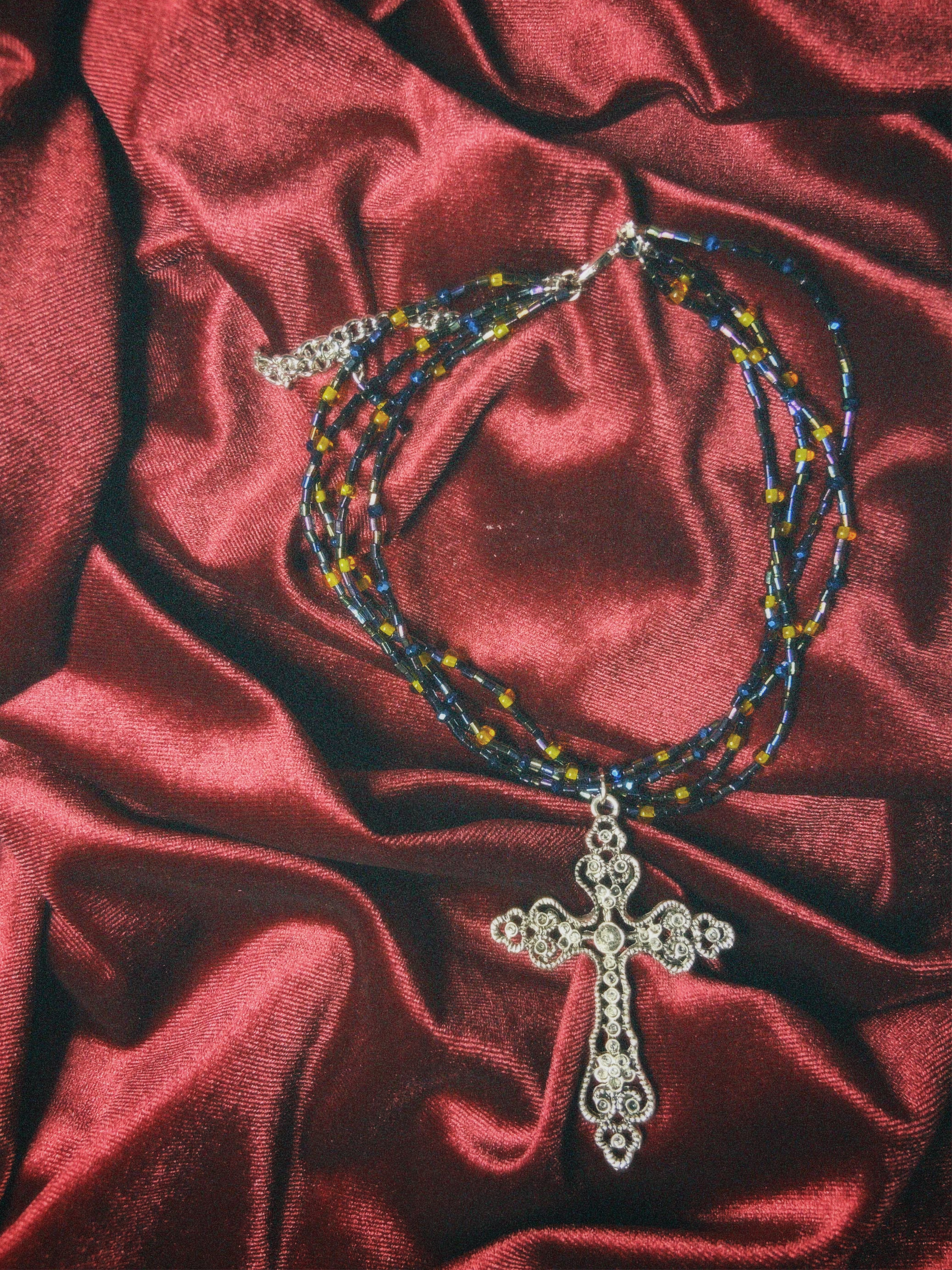 El Collar dark es un accesorio hecho a mano con mostacillas tornasoladas y un dije de cruz plateado. Su diseño único resalta la belleza de los detalles, convirtiéndolo en el complemento perfecto para cualquier ocasión.