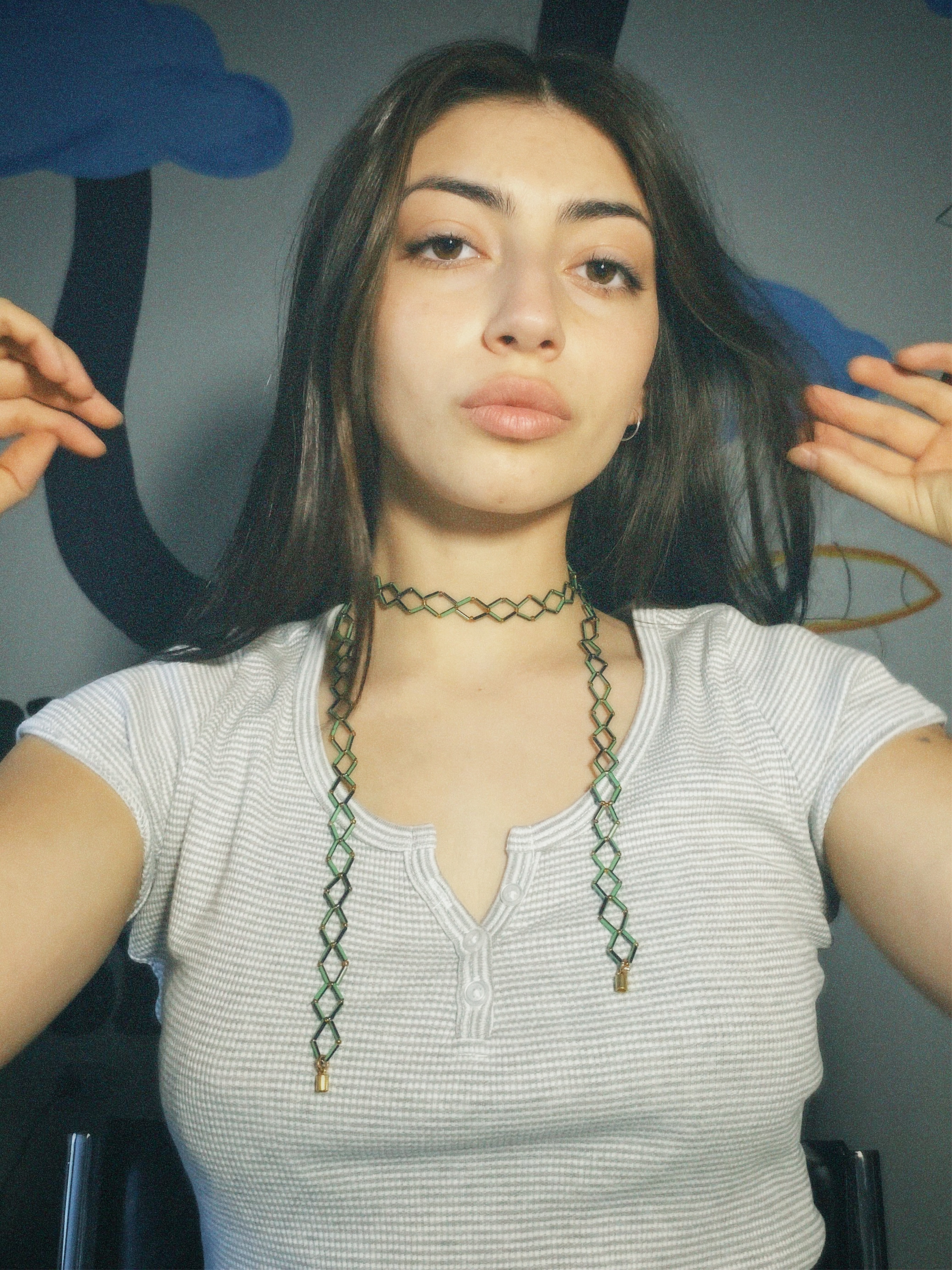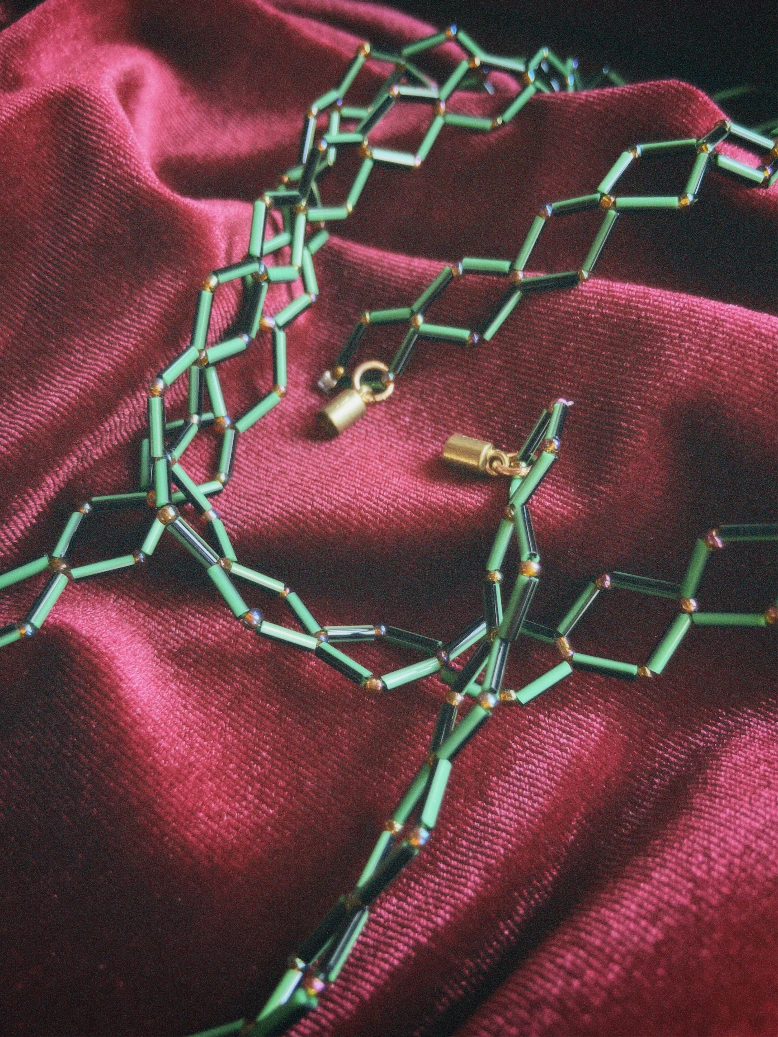 El Collar Multiuso es un acccesorio hecho a mano de canutillos verdes y detalles en negro. Su diseño versátil te permite llevarlo de múltiples maneras, convirtiéndolo en el complemento ideal para cualquier ocasión. Un solo collar, infinitas formas de expresarte.
