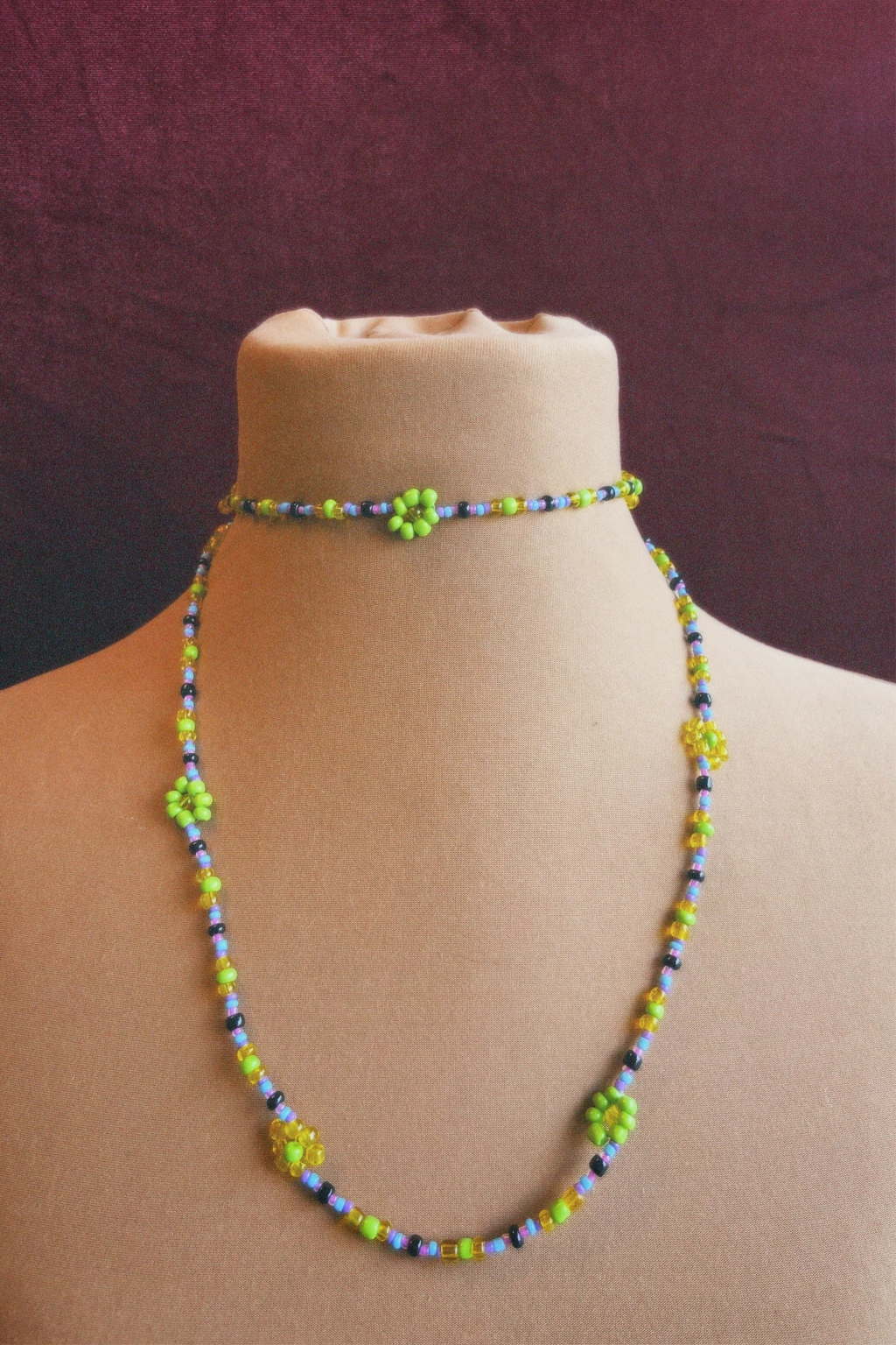 El Collar Multiuso es un acccesorio hecho a mano de mostacillas en tonos verdes claro y celestes. Su diseño versátil te permite llevarlo de múltiples maneras, convirtiéndolo en el complemento ideal para cualquier ocasión. Un solo collar, infinitas formas de expresarte.