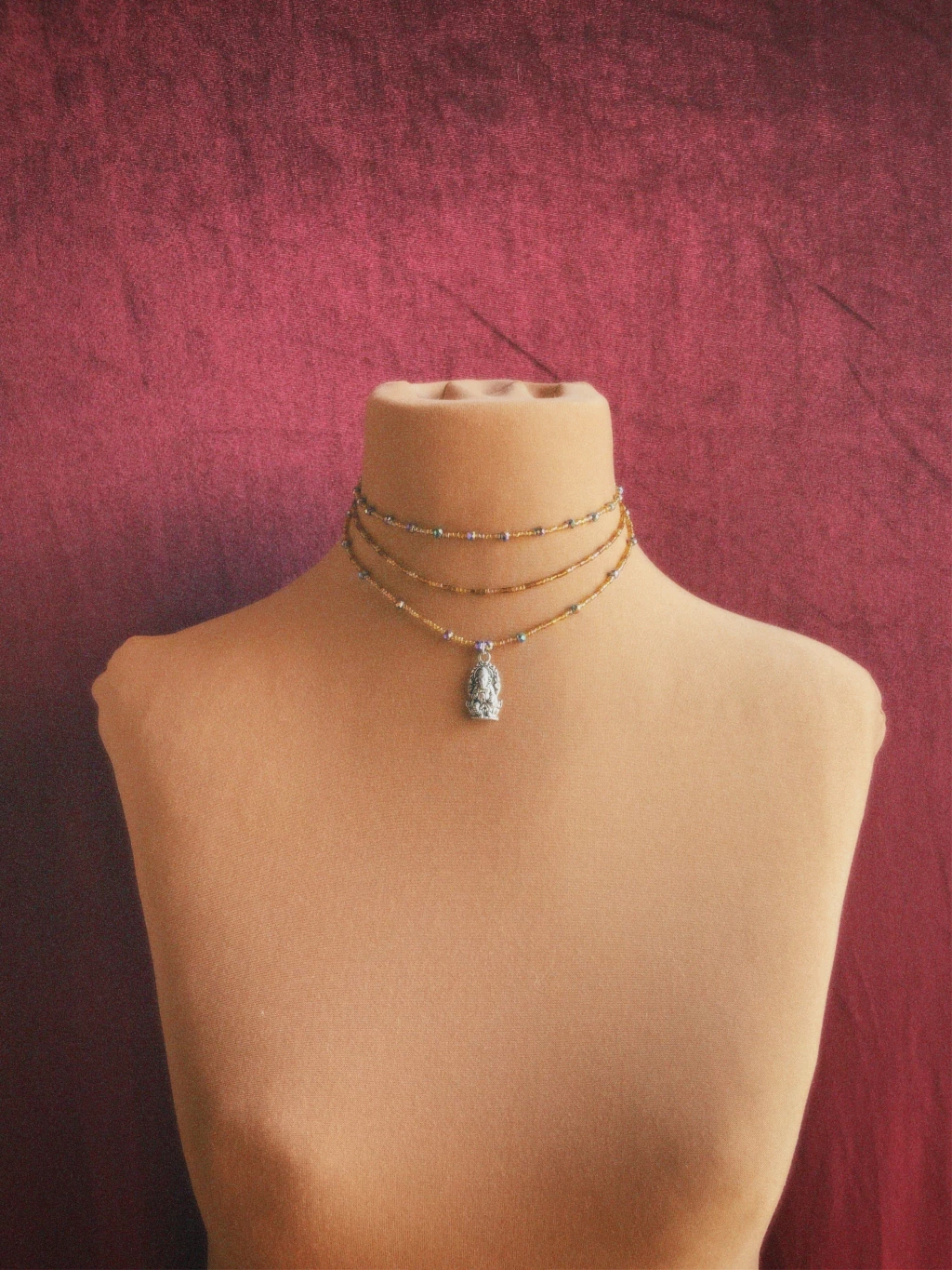El Collar Triple es un accesorio compuesto por tres tiras unidas en una sola pieza. Su diseño en capas agrega profundidad y sofisticación, creando un efecto visual impactante que realza cualquier look. Una sola pieza, tres niveles de estilo y elegancia.
